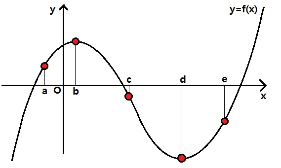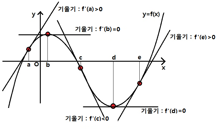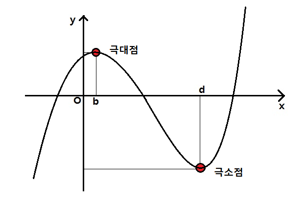 여기서 기울기의 값이 0이 되는 것에 주목할 필요가 있어요. 위의 그림에서는 접선의 기울기가 0이 되는 접점의 x좌표가 x=b, x=d인 경우인데요, 이 점이 극대 , 극소라는 점이에요. 바로 이 점을 찾아야만 그래프를 가장 빠르게 그릴 수 있게 됩니다.