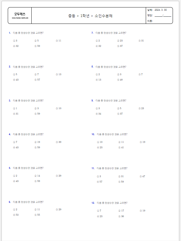 | 중1 수학 > 소인수분해 > 소수 찾기 문제 (0) | 2022.10.19 |