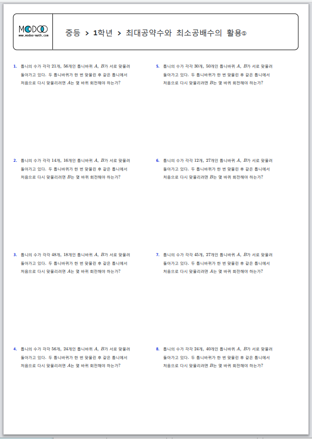 | 중1 수학 > 최대공약수와 최소공배수의 활용 > 동시에 출발하여 다시 만나는 경우 문제 PDF (0) | 2022.10.19 |