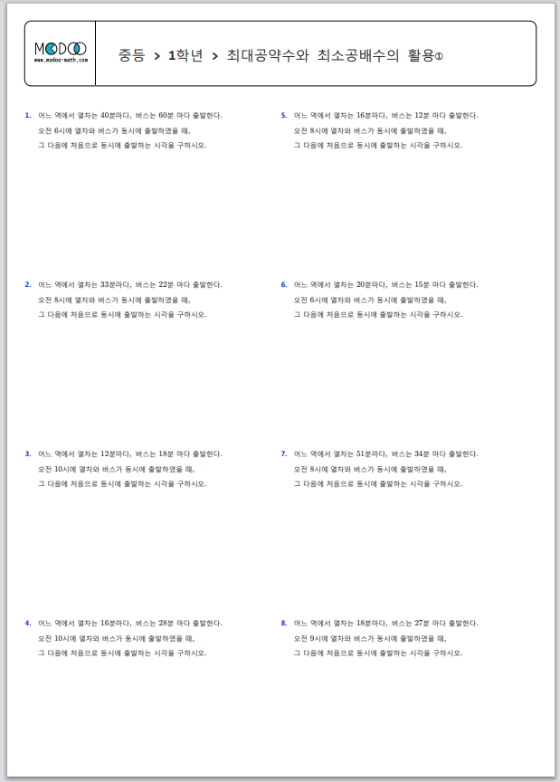 | 중1 수학 > 최대공약수와 최소공배수의 활용 > 어느 수로 나누어도 같은 수가 남는 문제 PDF (0) | 2022.10.19 |