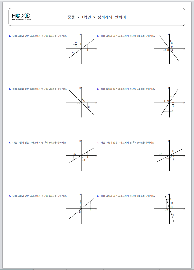 | 중1 수학 > 정비례와 반비례 > 정비례 그래프 위의 점P의 x좌표 구하기 연습문제 프린트 (0) | 2022.10.20 |