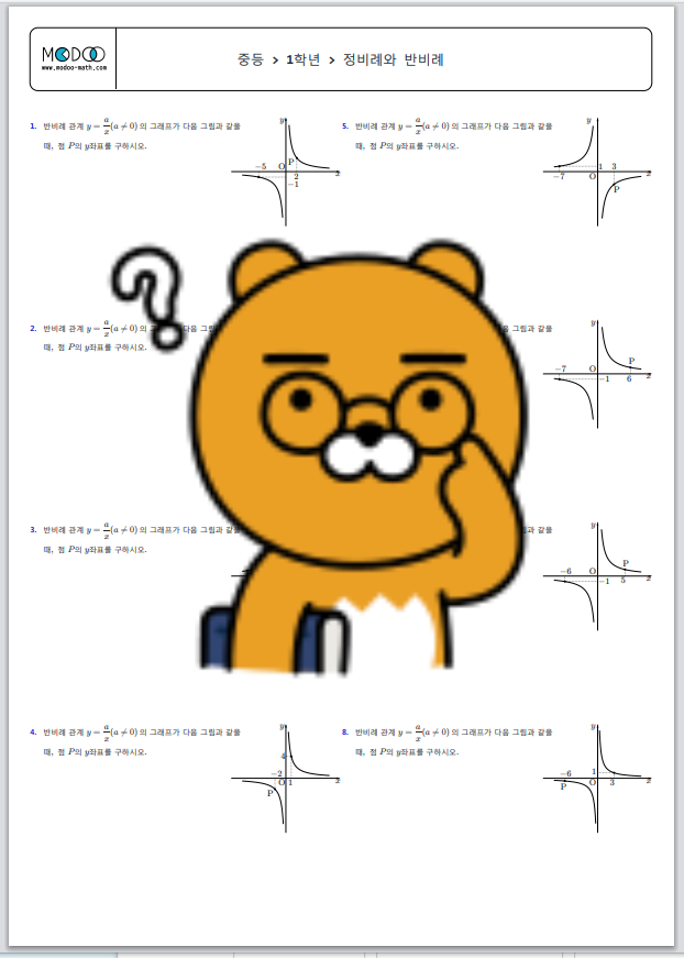 | 중1 수학 > 정비례와 반비례 > 정비례 그래프 위의 점P의 y좌표 구하기 연습문제 프린트 (0) | 2022.10.20 |