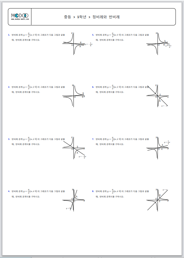 | 중1 수학 > 정비례와 반비례 > 반비례 그래프 위의 사각형 넓이 구하기 연습문제 프린트 (0) | 2022.10.20 |