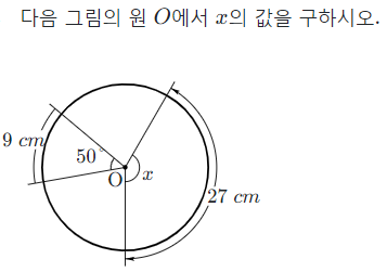 이 문제에서 중심각과 호의 관계를 알아야 해요. 방금 공부한 대로 호의 길이와 중심각의 크기는 정비례관계이므로 호의 길이가 3배이면 중심각의 크기도 3배이죠. 따라서 x=150˚ 입니다.