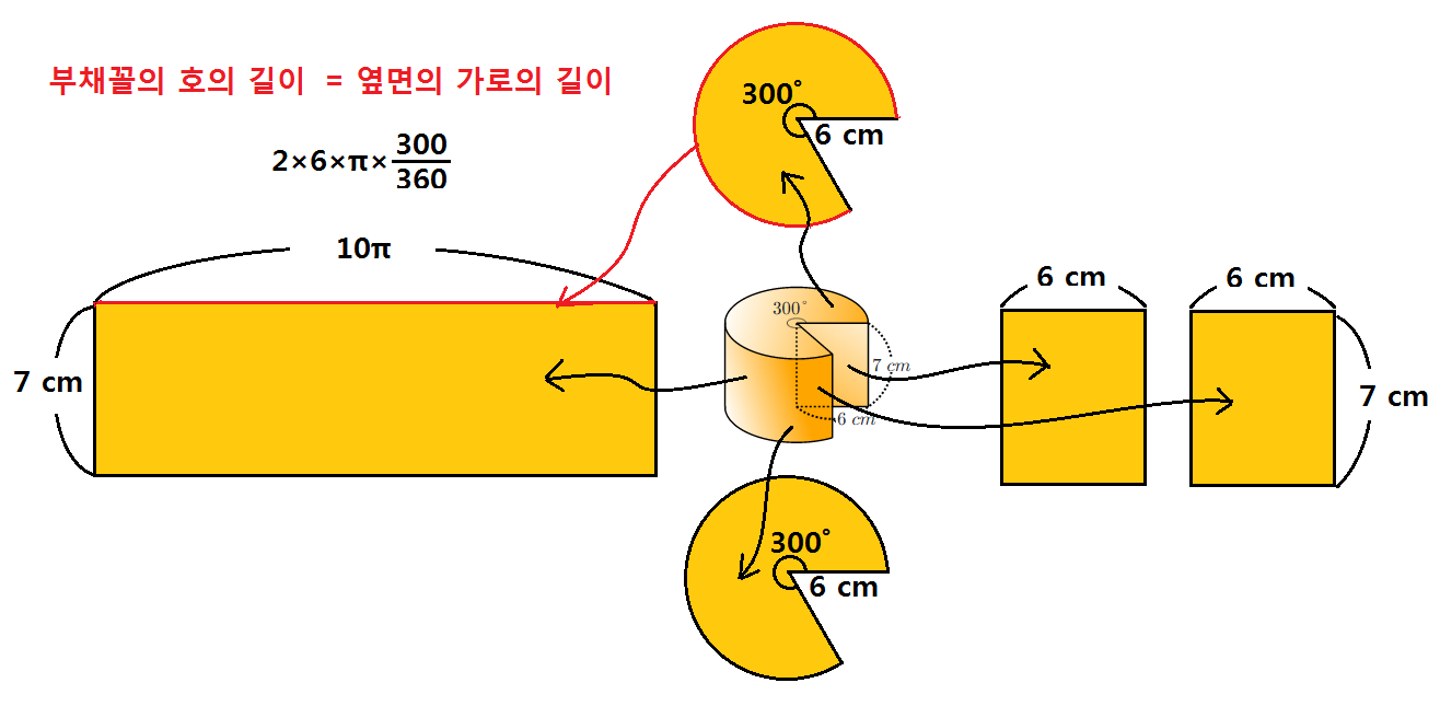옆면을 다시 분류하면 부채꼴의 호의 길이를 가로의 길이로 가지는 긴 직각사각형과